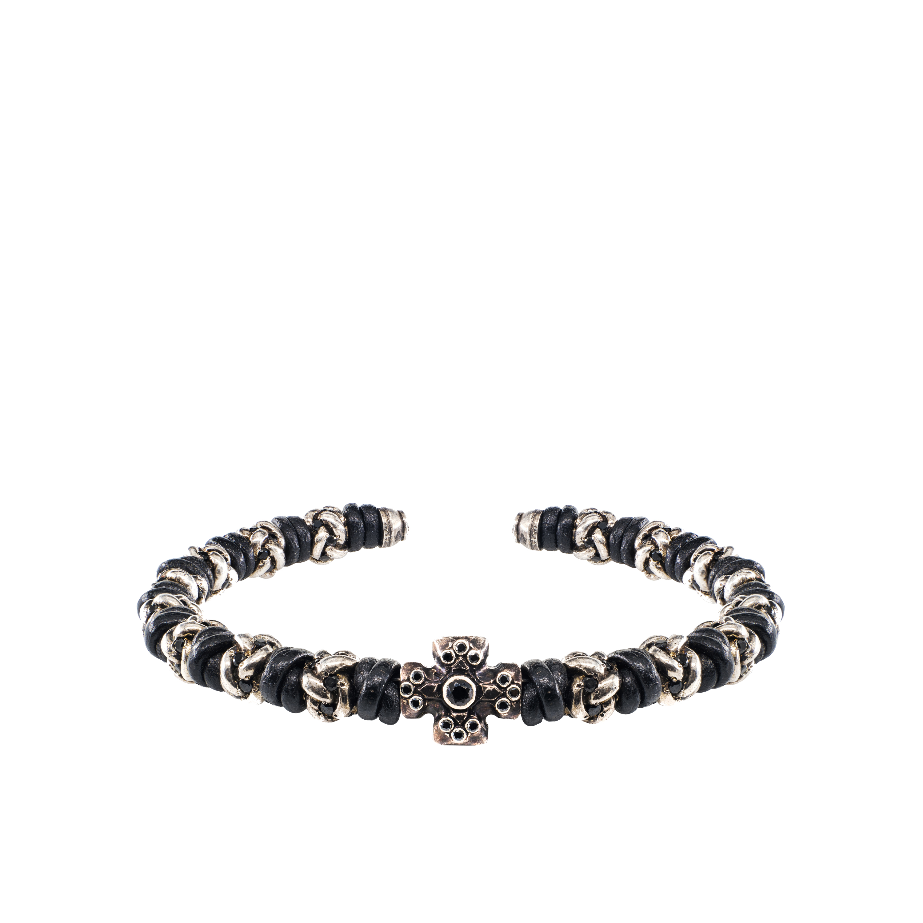 Black Strap Bangle Bracelet by Be Unique features 33 knots in a combination of 16 Be Unique’s patented Glossy knots in Antique finish with black stones and 17 leather knots in Cool Black Color, Armour Cross with Shiny Black stones. Cross symbol and exactly 33 knots count are subtly referencing traditions of Orthodox Rosary design. The bracelet can be personalised by engraving initials on the Cross symbol. It is very comfortable and easy to wear.