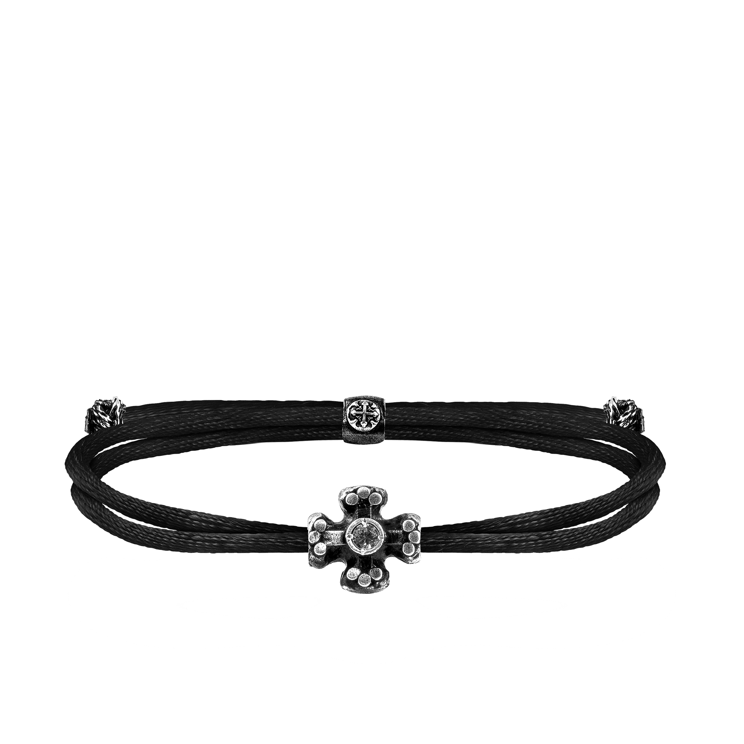 Bracelet that lasts a lifetime. Meet Charm Life, one of the Be Unique's most beloved bracelets. This bracelet features Armour Petit cross in Antique finish with Shiny White stone, Be Unique's Logo Tunnel Closure System, two Be Unique's patented Glossy knots and silky soft rope in Cool Black colour. Central positioned cross element is subtly referencing traditions of Orthodox jewelery design. Skin friendly rope material and non-allergic silver oxidation process ensure it is an ideal piece for everyday and even warm-weather wear. Can be worn solo or stacked with other pieces. This bracelet can be personalised by engraving initials on the Cross symbol. Very comfortable and easy to wear.