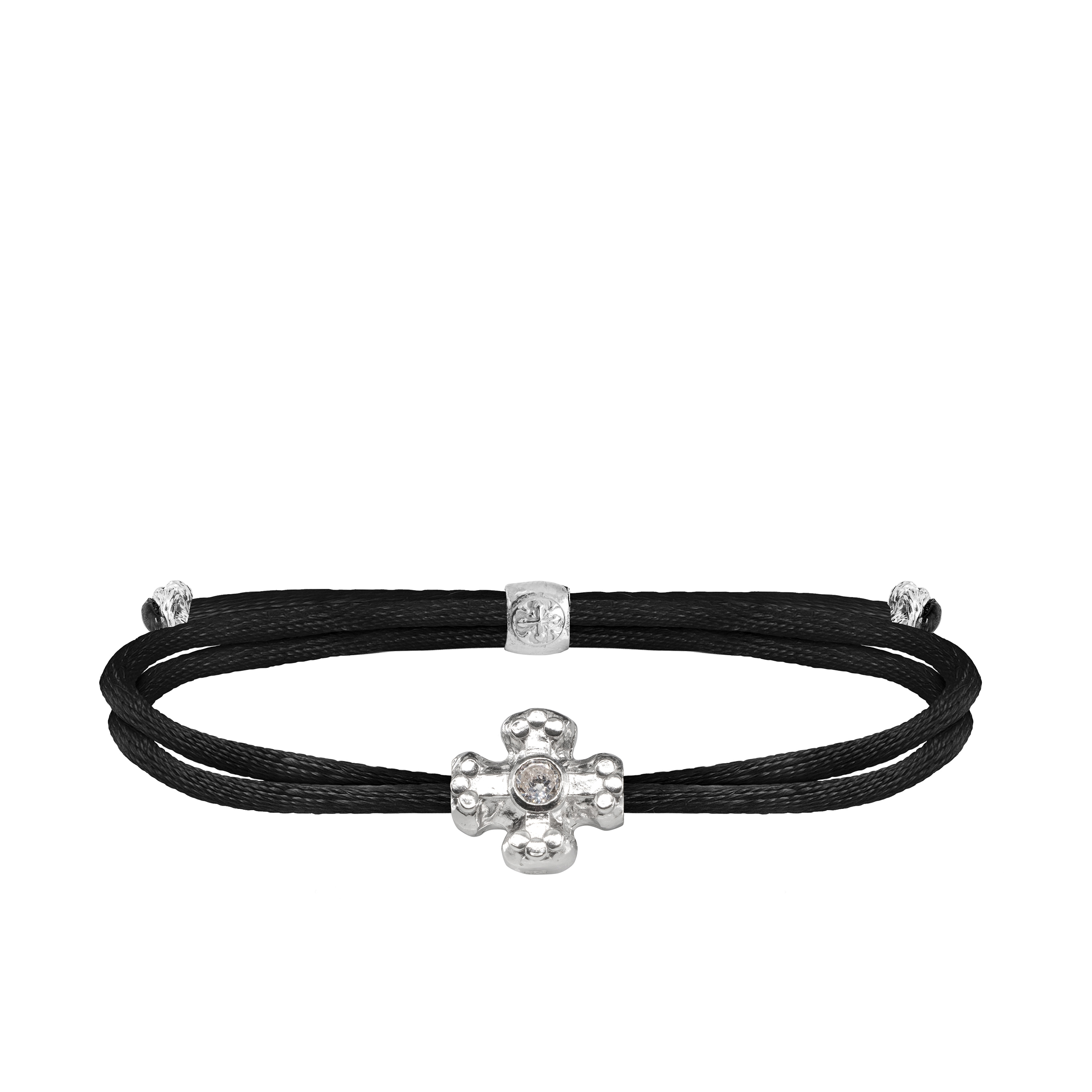 Bracelet that lasts a lifetime. Meet Charm Life, one of the Be Unique's most beloved bracelets. This bracelet features Armour Petit cross in White Gold finish with Shiny White stone, Be Unique's Logo Tunnel Closure System, two Be Unique's patented Glossy knots and silky soft rope in Cool Black colour. Central positioned cross element is subtly referencing traditions of Orthodox jewelery design. Skin friendly rope material and non-allergic silver oxidation process ensure it is an ideal piece for everyday and even warm-weather wear. Can be worn solo or stacked with other pieces. This bracelet can be personalised by engraving initials on the Cross symbol. Very comfortable and easy to wear.