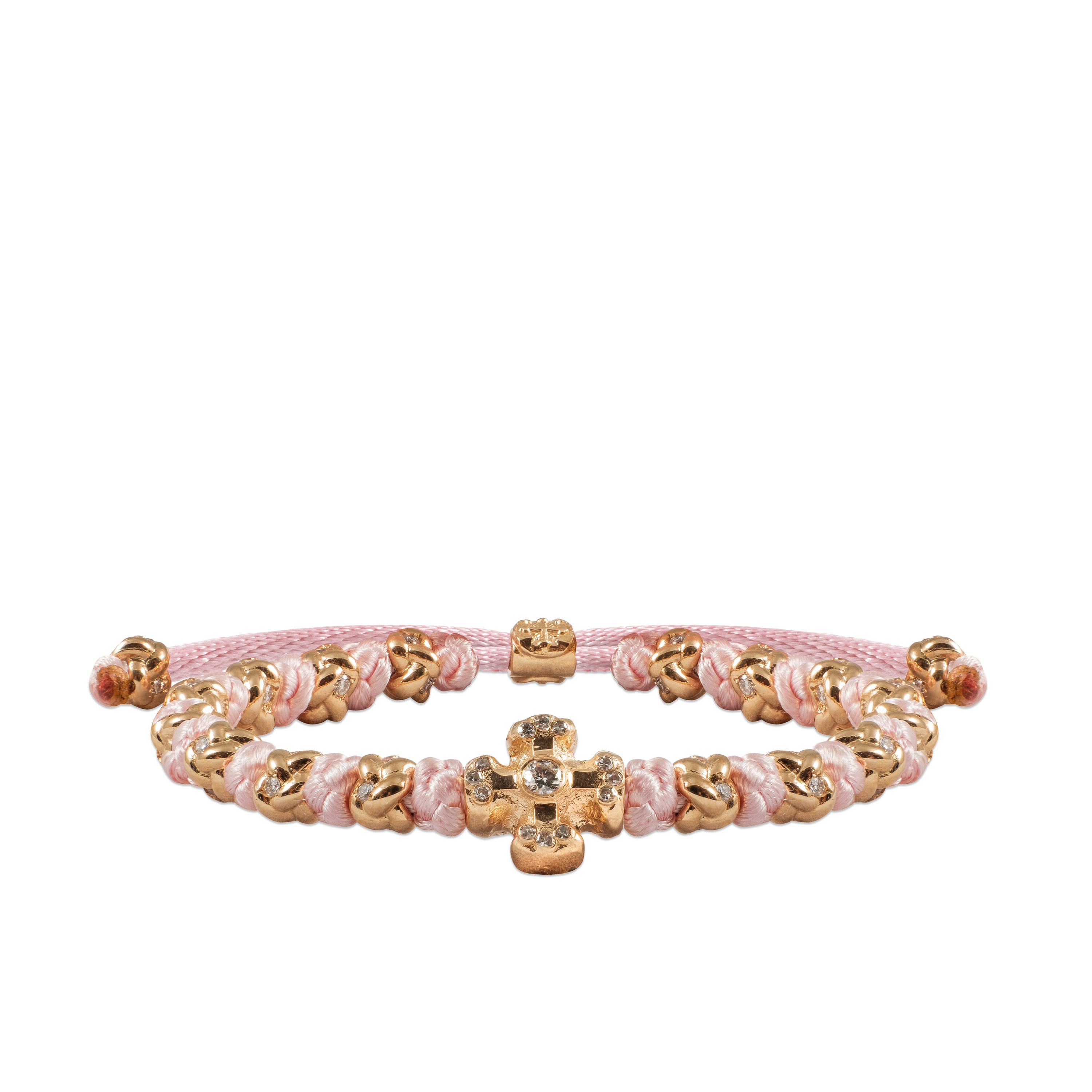 Bibbidi-Bobbidi-Boo - you can be a princess too. Nautika Mini Bracelet by Be Unique features 33 knots in a combination of 16 Be Unique's patented Glossy knots from 18kt rose gold and 17 hand-knitted knots in Princess Pink colour, Armour Cross from 18kt rose gold and 1.64ct Brilliant cut diamond and Be Unique's Logo tunnel Closure System. This sweet little bracelet gives magical appearance and modern allure, while subtly referencing traditions of Orthodox Rosary design. This bracelet can be personalised by engraving initials on the Cross symbol. Very comfortable and easy to wear.