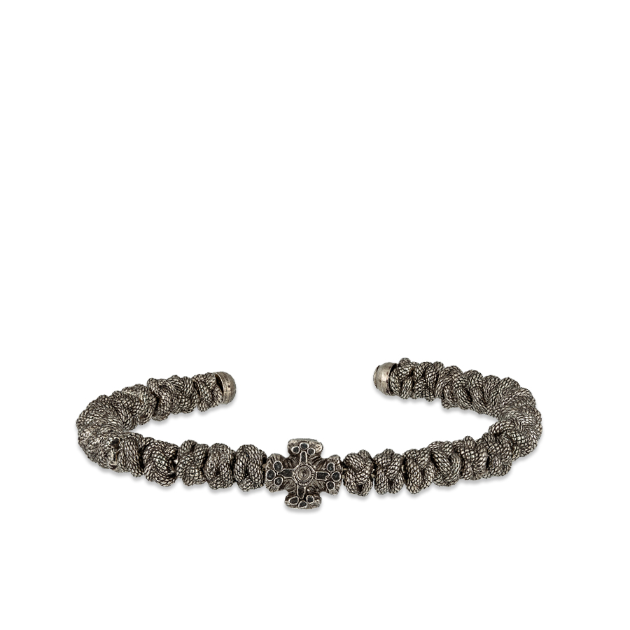 Show your confidence, ambition and prosperity. Rebel Bangle Bracelet by Be Unique features 33 Be Unique's patented Reptile knots in Blue Steel finish and Armour Medium cross. Be Unique Reptile knots are inspired by genuine reptile skin and have exceptionaly detailed surface. Knots and cross are located on a Silver wire which allows them to move freely and make a very particular sound when they do so. Cross symbol and exactly 33 knots count are subtly referencing traditions of Orthodox Rosary design. This bracelet can be personalised by engraving initials on the Cross symbol. Bangle's modern open band shape makes it very comfortable and easy to wear.