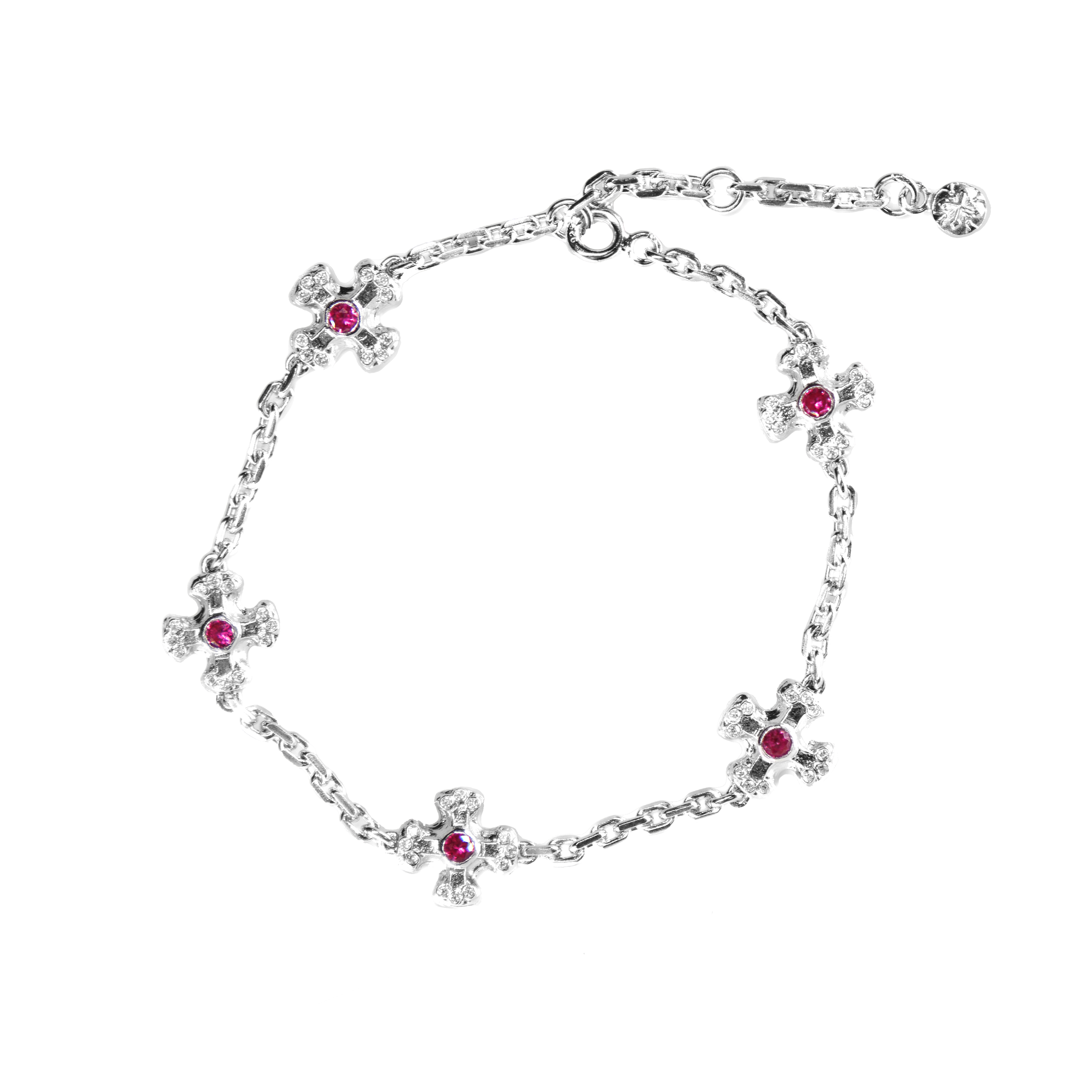 Shiny Red gemstones on each and every of five Armour Petit crosses located along the full lenght of the Silver chain in White Gold finish characterise the Be Unique's Red Drop bracelet. This timeless, feminine jewel will complement any look with its precious sparkle.